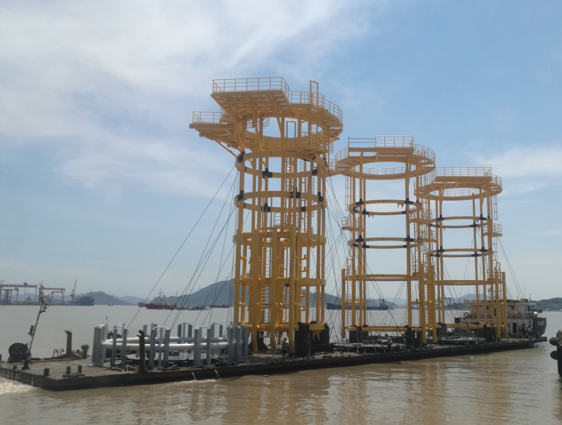 8月7日,在舟山大神洲造船有限公司生產場地上,公司今年第二批風電套籠鋼結構借助400T龍門吊順利搭上“奧海08”運輸船,完成交付。今年4月底開始,揚帆集團通用船配公司承接了一批風電套籠鋼結構訂單,到目前為止,共計29套,這批合同總價超5000萬元。這也是目前揚帆集團接到的最大的風電套籠鋼結構生產訂單,整個訂單生產周期將持續到今年11月。大神洲公司負責這批訂單的組裝和涂裝作業。近日,第三批風電套籠即將交付。